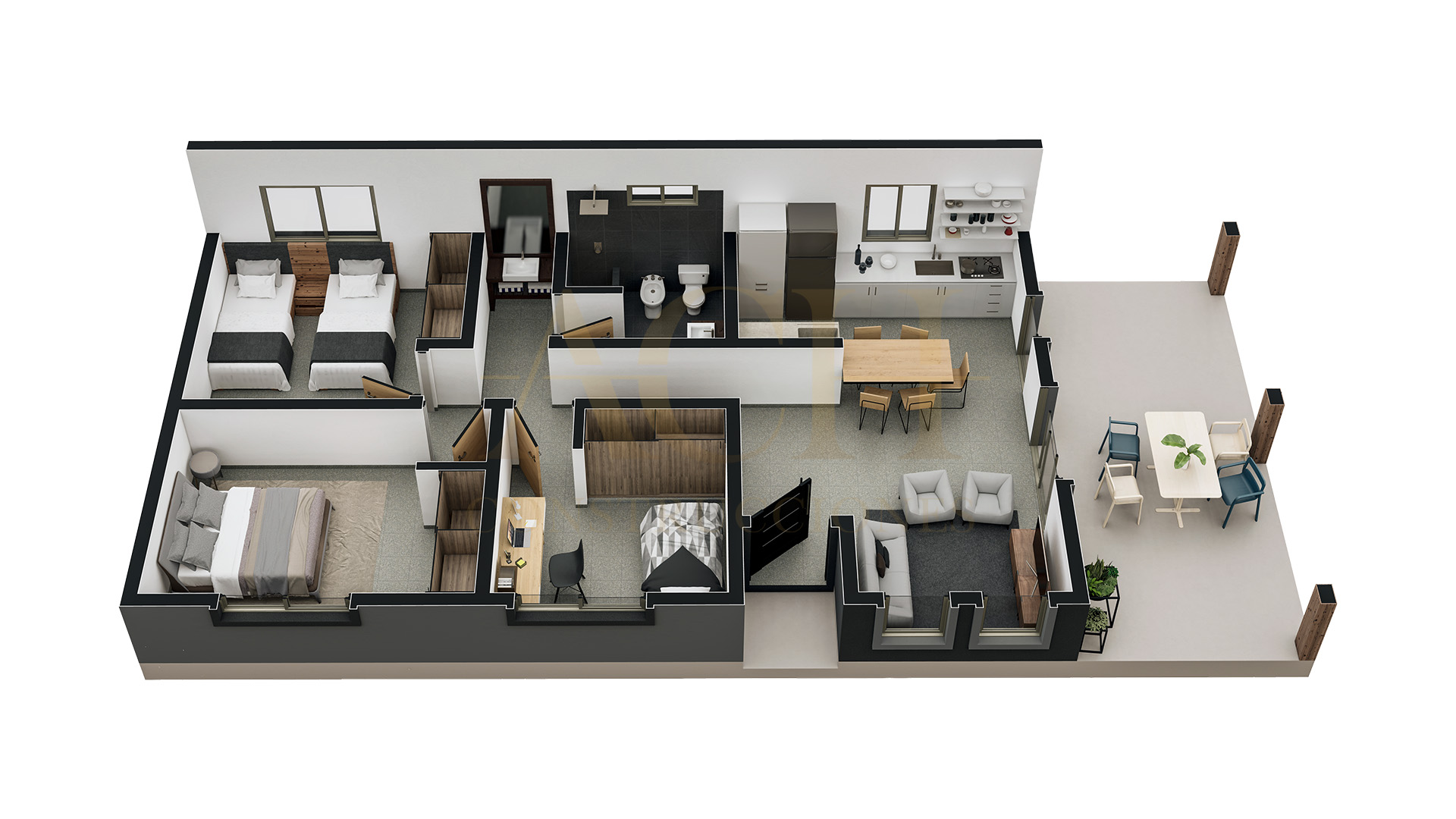 PANELES: Del tipo portante, constituidos por un bastidor estructural de madera maciza saligna. Estructura general de 4X2″ (Ext) Y 3X1 (Int) + OSB + Barrera hidrofuga con una separación de 40 cm. entre sí. Su parte exterior se reviste con placas cementicias atornilladas (fibrocemento) Eternit de 6mm.